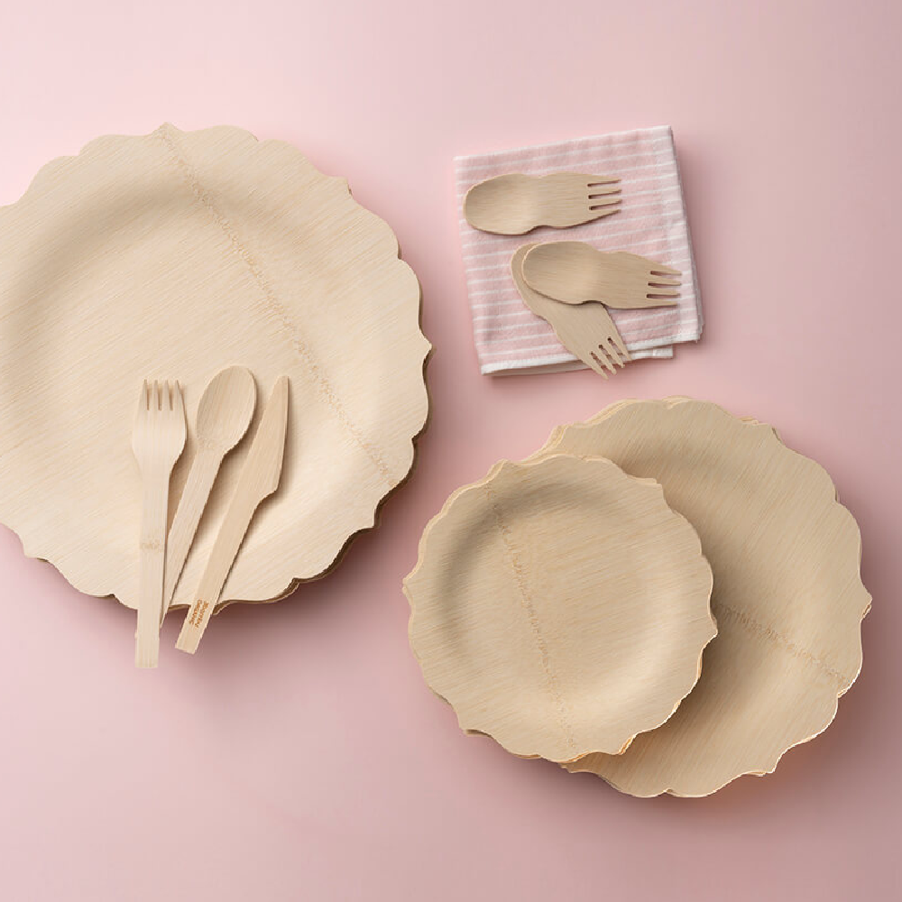 The ultimate plastic-free solution for your eco-friendly event needs. Choosing compostable dinnerware shouldn't have to mean giving up style, which is why our plates are an easy choice. Made entirely from natural and attractive bamboo, our dinnerware is sturdier than paper, much more attractive than plastic, and offers a clean and consistent look that palm leaf plates simply can't compare to.
